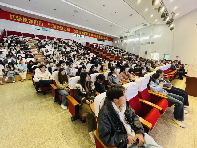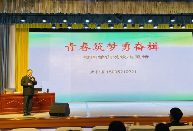 特邀主讲人管理工程学院退休教授、管理学博士、硕士生导师卢松泉围绕辨析社会环境、认清职场岗位、识别自身资源等七个方面开展“筑梦奋楫展宏图”主题讲座。